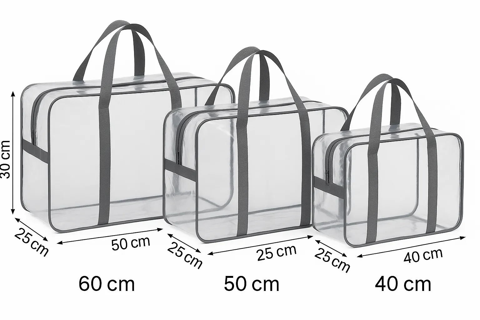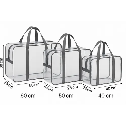 Обираючи цей набір, ви отримуєте функціональні сумки з прозорою поверхнею, зручними ручками та блискавкою по всьому периметру — поєднання комфорту і надійності, перевірене часом. Замовляйте вже сьогодні, щоб максимально спростити організацію зберігання і підтримувати порядок у своєму домі та подорожах!