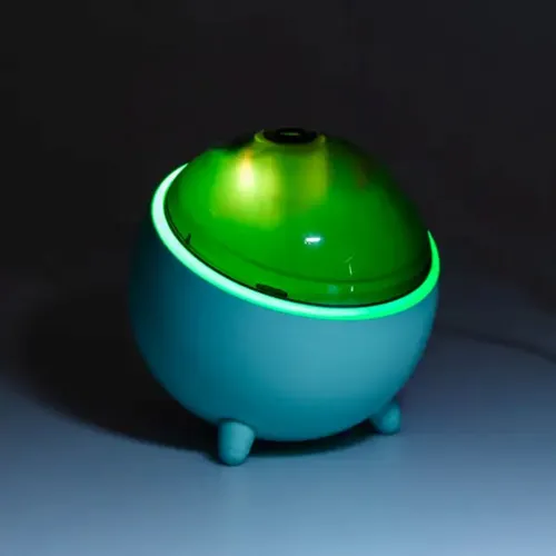 Портативний зволожувач повітря для дому об'ємом 300 мл у зеленому кольорі представлений пристроєм з ультразвуковим принципом роботи та USB-живленням, що забезпечує комфортне використання як у домашніх умовах, так і в офісі або під час поїздок. Компактні розміри (100 мм у висоту та ширину) дозволяють розмістити прилад на столі або на підлозі, залежно від уподобань і простору.