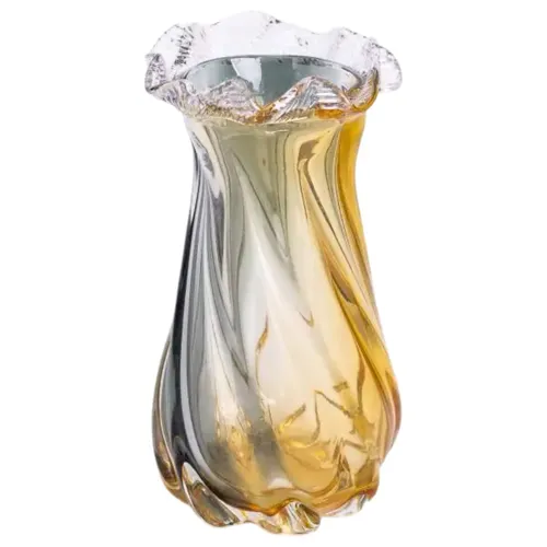 Крім того, вази такого типу часто застосовуються для оформлення святкових заходів і фотосесій, оскільки їх лаконічність дозволяє акцентувати увагу на квітах. Кольорове скло в жовто-сірій гамі гармонійно виглядає з теплою і нейтральною палітрою інтер’єру, доповнюючи підбірки квітів і декору.