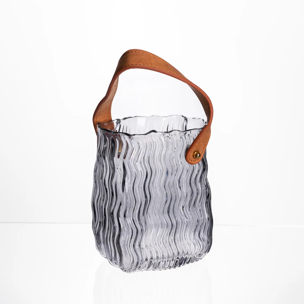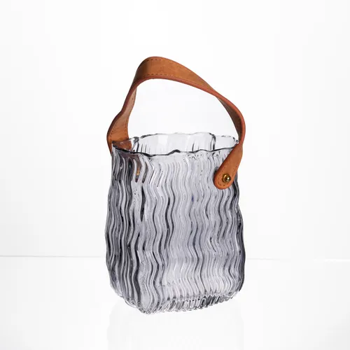 Декоративна скляна ваза-сумочка з ручкою — це унікальний елемент інтер'єру, що поєднує естетику та практичність. Вона виконана з прозорого скла з хвилястим візерунком, який надає поверхні фактурності та цікавого світлорозсіювання. Оригінальна штучна шкіряна ручка на металевому кріпленні служить не лише декоративним акцентом, а й зручним елементом для перенесення.