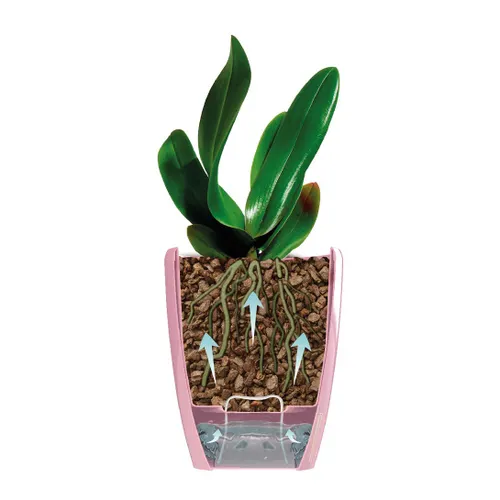 Дренажна система з отворами у внутрішньому горщику та резервуаром для надлишків води запобігає застою рідини, що знижує ризик захворювань коренів. Така конструкція сприяє циркуляції повітря та рівномірному зволоженню субстрату, забезпечуючи здоровий розвиток орхідеї.