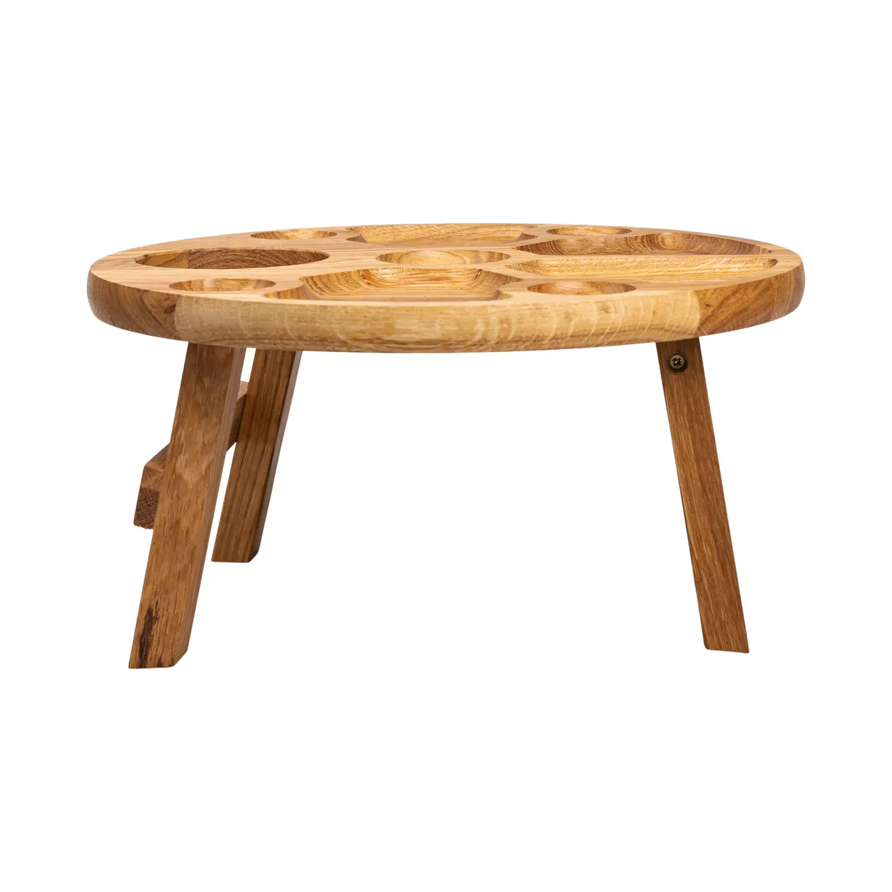 Дуб володіє високою міцністю та стійкістю до зношування, що дозволяє використовувати столик як в домашніх умовах, так і на природу. Натуральна текстура дерева надає предмету естетичну привабливість і підкреслює його екологічність. Вбудовані секції слугують для розміщення закусок, таких як сири, горіхи та фрукти, що сприяє створенню повноцінної атмосфери приємного відпочинку.