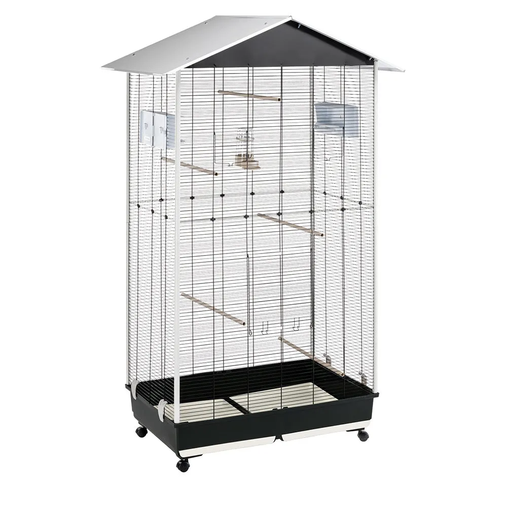 Вольєр для птахів з аксесуарами й коліщатками 95 x 64 x h 165,5 см NOTA MEDIUM є надійним і довговічним рішенням для утримання канарок, папуг і інших дрібних екзотичних птахів. Виготовлений з металу з захисним покриттям і доповнений глибоким пластиковим дном, він забезпечує комфортні умови птахам і зручність експлуатації власникам. Конструкція включає міцні пластикові стовпчики на кутах, які підвищують стійкість каркасу й захищають від деформацій.