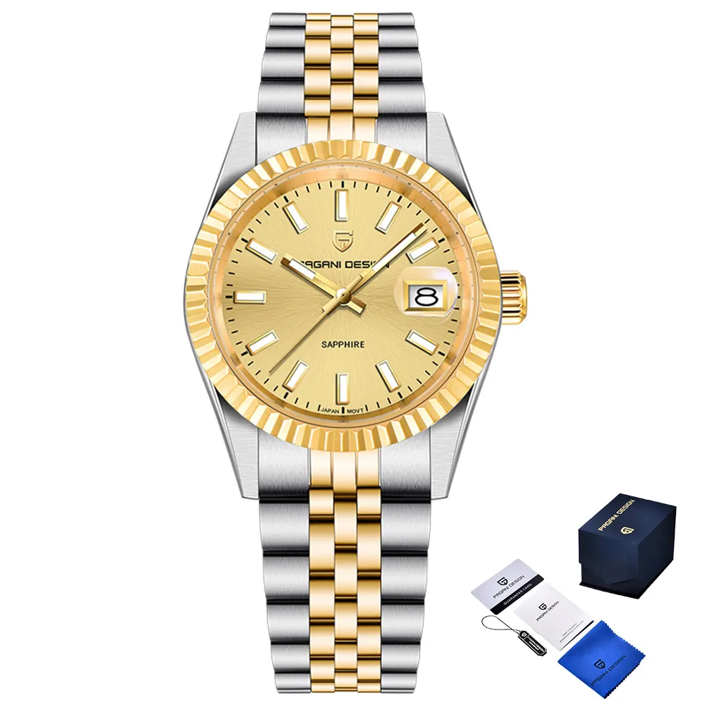 Матеріал корпусу та браслета — нержавіюча сталь, що забезпечує високу міцність і антикорозійні властивості. Комбінація сріблястого та золотого кольорів візуально підкреслює унікальний стиль і розкіш моделей із колекції Pagani Design. Довжина ремінця становить 24 мм, що забезпечує комфортне носіння на зап’ясті будь-якого розміру.
