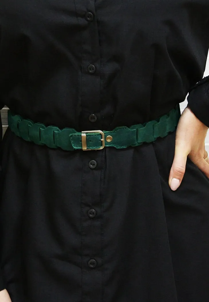 Використання поясного аксесуару в стилі бохо допомагає підкреслити індивідуальність і творчий підхід до створення образу. Зелений колір додає свіжості та натуральності, гармоніюючи з природними відтінками в одязі.
