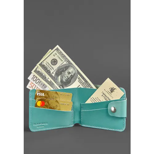 Жіноче шкіряне портмоне 4.3 бірюзового кольору ідеально підходить для використання щодня завдяки його легкості та практичності. Закривається надійно та легко на досить міцну кнопку. Можете не переживати, що портмоне випадково розкриється, наші майстри чудово попрацювали, щоб цього не сталося.
