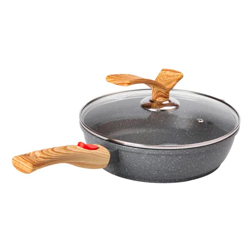 Сковорода оснащена жаропрочной стеклянной крышкой с отверстием для выхода пара, благодаря чему можно контролировать уровень влажности при готовке. Ручка выполнена из бакелита и не нагревается, что гарантирует безопасность при работе. Многослойное дно толщиной 5 мм способствует быстрому и равномерному распределению тепла по всей поверхности сковороды.