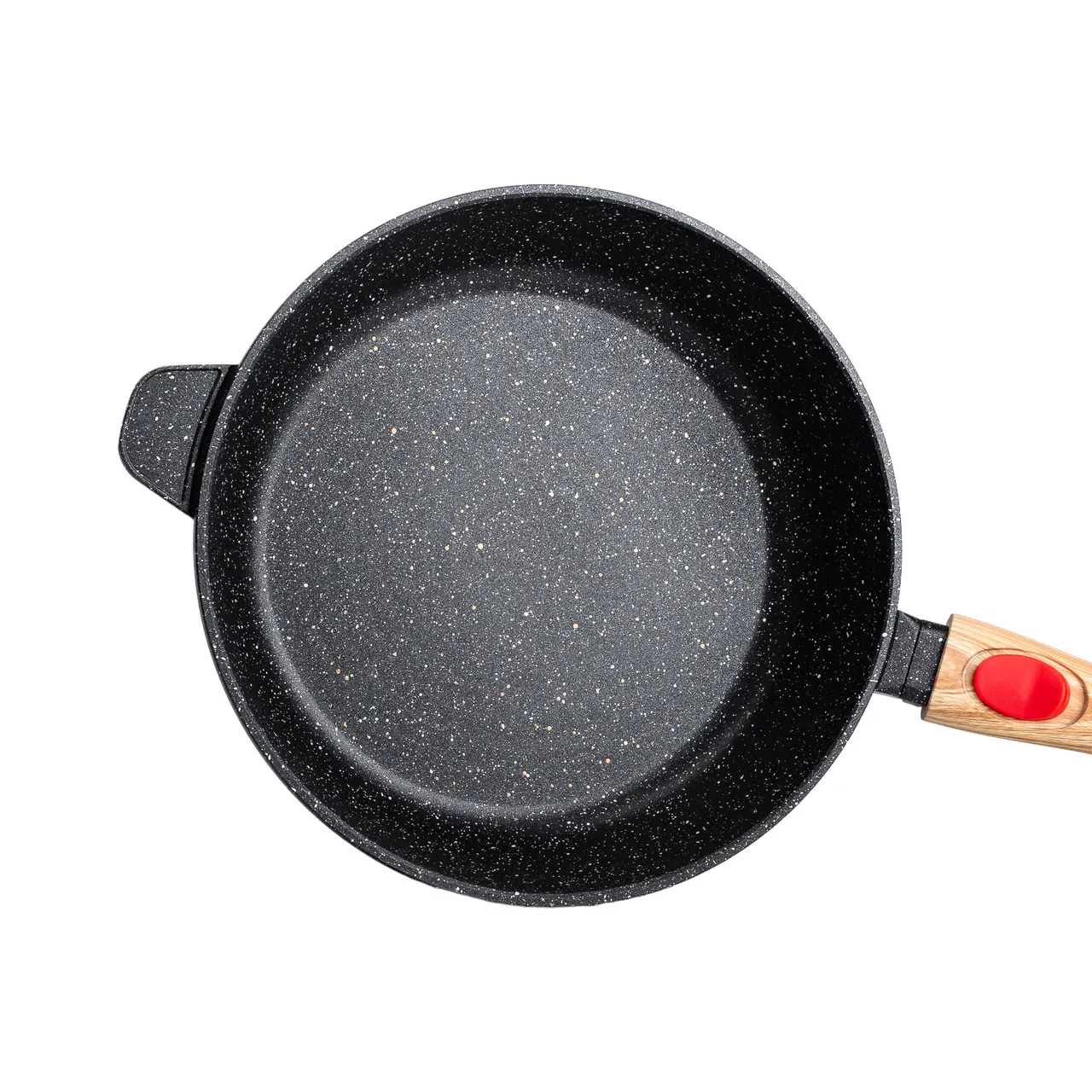 Толщина дна в 5 мм и многослойная структура обеспечивают оптимальную теплоотдачу и устойчивость к деформации при нагревании. Алюминий выбран за его отличные тепловые характеристики и легкость посуды. Форма сковороды круглая и глубокая, что делает ее универсальной для различных видов готовки.