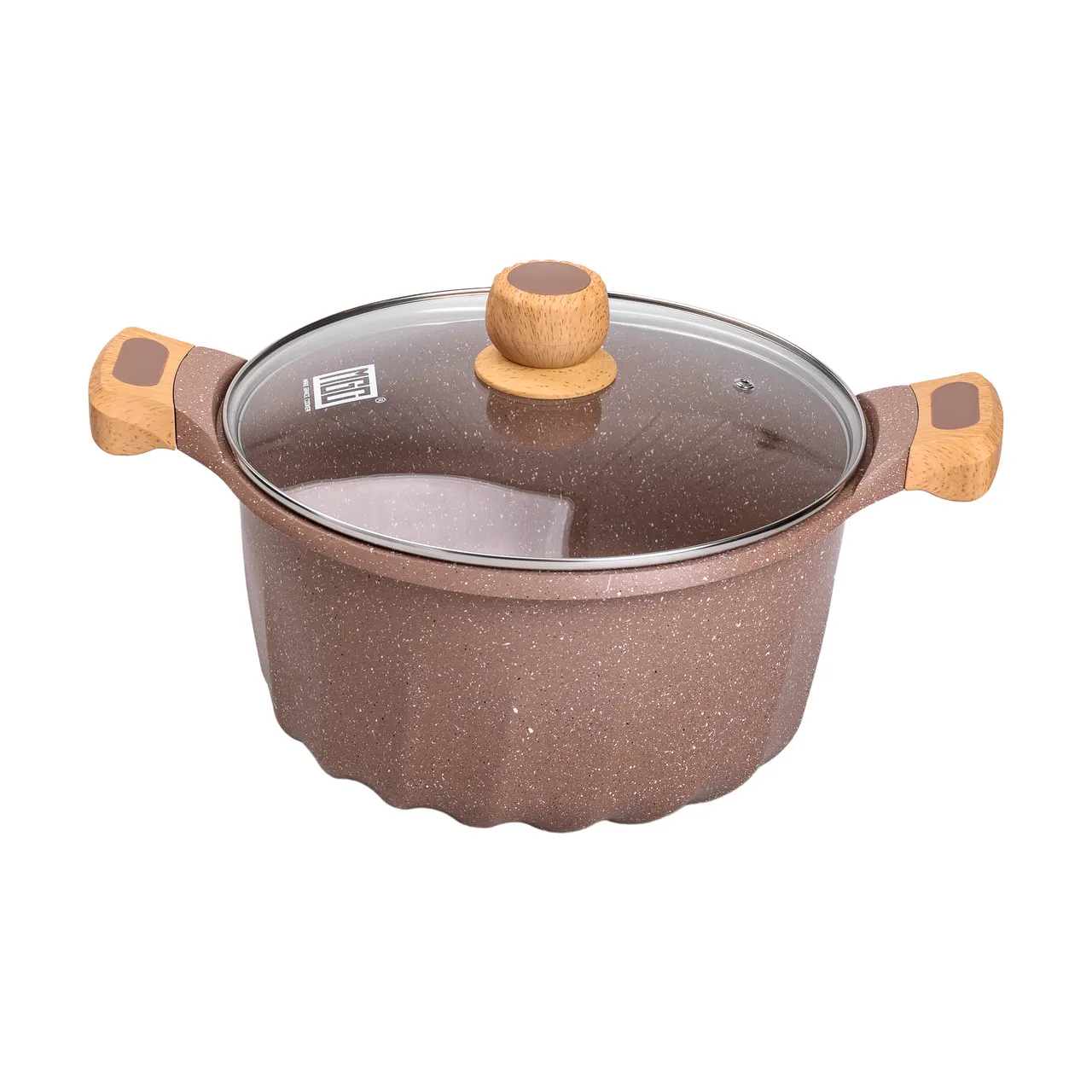 Алюминий как основной материал в сочетании с мраморным антипригарным покрытием обеспечивает легкий вес и надежность. Внешнее покрытие кофейного цвета сохраняет эстетичный вид кастрюли даже при интенсивной эксплуатации.