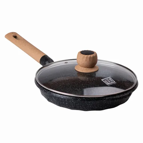 Высота стенок изделия 5,2 см, что позволяет готовить обильные порции блюд. Сковорода оснащена жаропрочной стеклянной крышкой с отверстием для выхода пара, что помогает контролировать уровень влаги во время приготовления и сохраняет вкусовые качества продуктов.