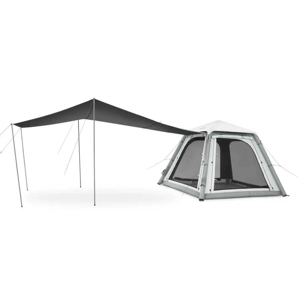 В комплекте также есть дополнительный навес-тент (9.7 м²). Его можно устанавливать отдельно от палатки для организации зоны отдыха, полевой кухни или укрытия от солнца.