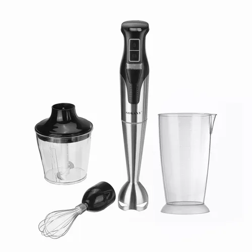 Модель выделяется универсальностью 4 в 1: помимо основной насадки, в комплекте есть венчик для взбивания и измельчитель с двумя лезвиями объемом 800 мл. Такая комплектация позволяет готовить смузи, коктейли, пюре, соусы и многое другое, используя минимальное количество кухонной техники.