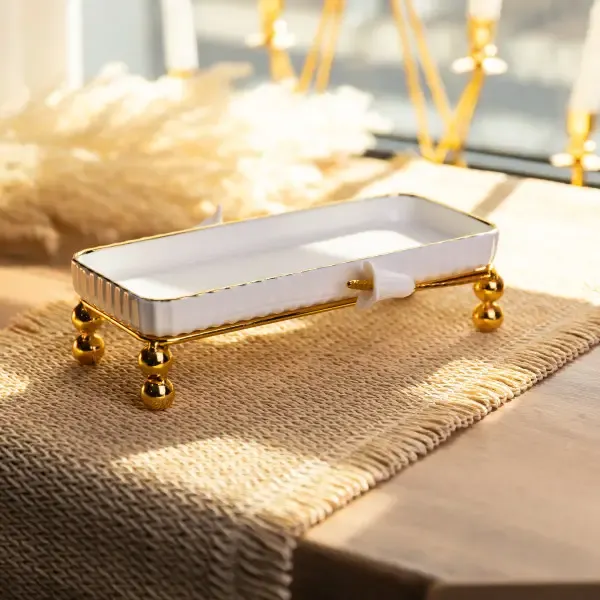 Прямоугольное фарфоровое блюдо на изящной металлической подставке. Модель отличается оригинальным декоративным решением: ручки подставки выполнены в виде распустившихся цветов белой кала с золотистыми ячейками. Особенности: Материал: Качественный белый фарфор. Материал имеет гладкую, плотную структуру, устойчив к термическим воздействиям и не впитывает запахи. Материал подставки: Металл с износостойким покрытием. Конструкция подставки обеспечивает устойчивое положение блюда и удобство его перемещения. Конструкция: Подставка оснащена ножками, которые приподнимают блюдо над поверхностью стола, защищая его от перегрева и царапин. Размер: Узкая вытянутая форма блюда оптимальна для подачи роликов, канапе, порционных десертов, сырных сет и мясных нарезок. Характеристики: Материал: фарфор Размеры: 25*10*3,5 см Высота с подставкой: 6,5 см Вес: 900 г