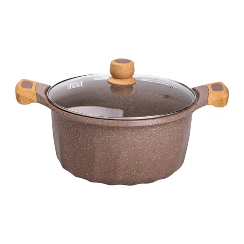 Ручки из бакелита литого типа обеспечивают надежное крепление и удобный захват, не нагреваются во время готовки, что повышает безопасность и комфорт пользователя. Цвет кастрюли — кофейный, что придаёт посуде стильный и современный вид, хорошо сочетающийся с интерьером любой кухни.