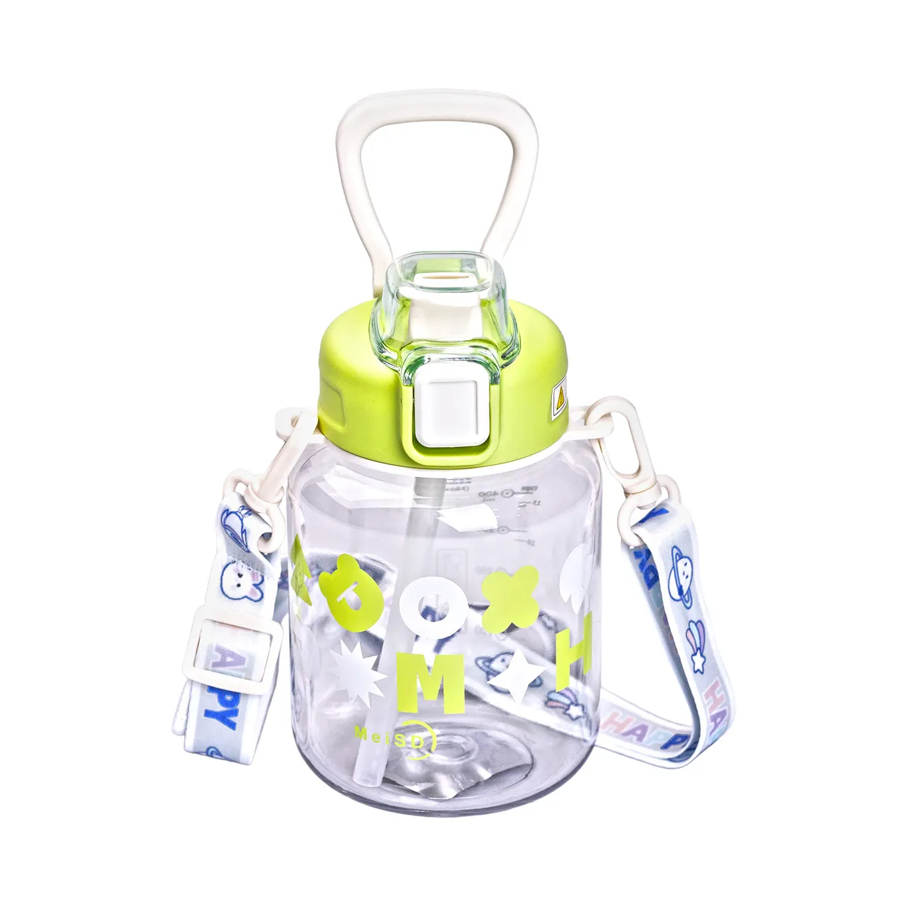 Для удобства переноски и фиксации бутылки предусмотрен ремешок, который можно крепить на сумку или рюкзак. Такой подход упрощает транспортировку и снижает риск потери бутылки во время прогулок, тренировок или школы.
