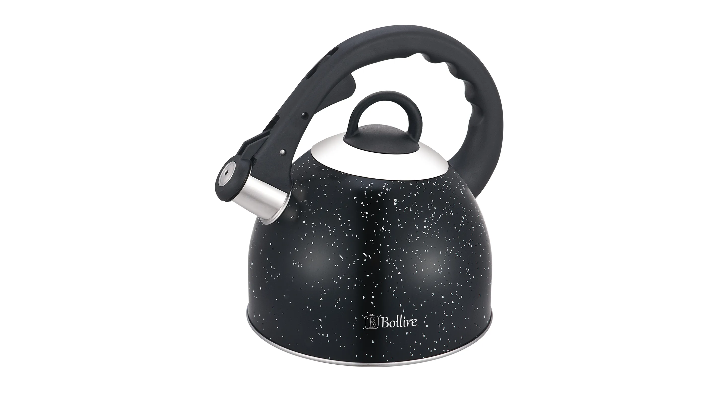 Чайник BOLLIRE 2,5 л матеріал: нержавіюча сталь 201; Об'єм: 2.5 л; товщина стінок – 0,5 мм; високоякісна нержавіюча сталь, нейлонова термостійка ручка з механізмом відкриття свистка. Мармурове зовнішнє покриття. Переваги: виключно жароміцний, удароміцний, зносостійкий, не схильний до корозії матеріал; має високі показники екологічної чистоти і зберігає чудовий зовнішній вигляд навіть після багаторічного використання; підходить для усіх видів плит.