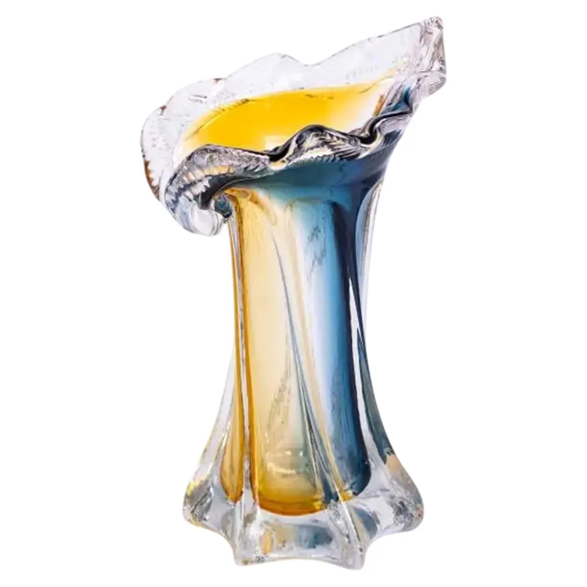 Уникальная фигурная форма вазы сочетает в себе эстетическую привлекательность и функциональность, делая ее универсальным элементом декора, подходящим для домашнего, офисного и общественного пространства. Цветовое решение — гармоничное сочетание желтого и синего, которое легко впишется в разнообразные стилистические направления.