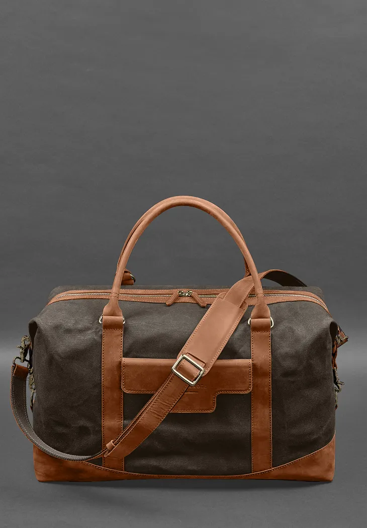 Дорожная сумка из коричневого канваса и натуральной светло-коричневой кожи Crazy Horse