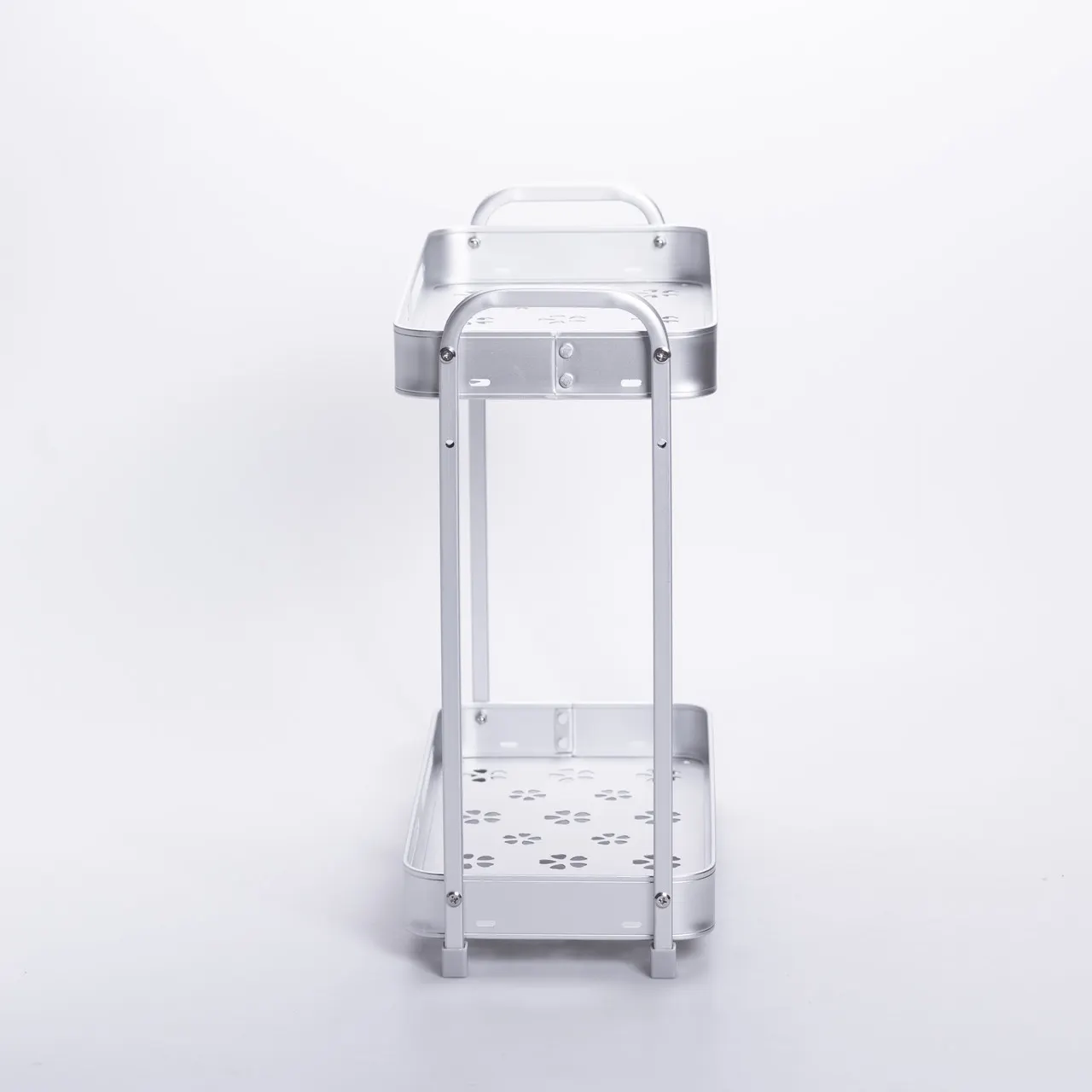 Конструкция двухъярусная: полка имеет два уровня с бортиками, которые надежно фиксируют предметы и предотвращают их случайное падение. Верхний ярус предназначен для хранения банок, тюбиков и флаконов, в то время как нижняя полка рассчитана на дозаторы, контейнеры и другие аксессуары. Перфорированная поверхность обеспечивает вентиляцию и эффективный слив воды, что способствует сохранению чистоты и предотвращает образование плесени.