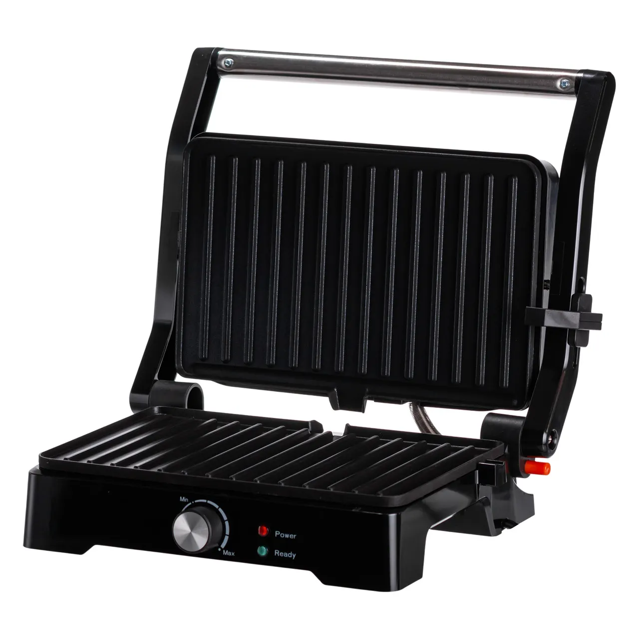 Прижимная конструкция гриля обеспечивает плотный контакт пищи с нагревательными пластинами, что сокращает время готовки и сохраняет сочность продуктов. Корпус выполнен из металла с жаростойким пластиком, а рабочие поверхности покрыты антипригарным рифленым покрытием, упрощающим уход и очистку.