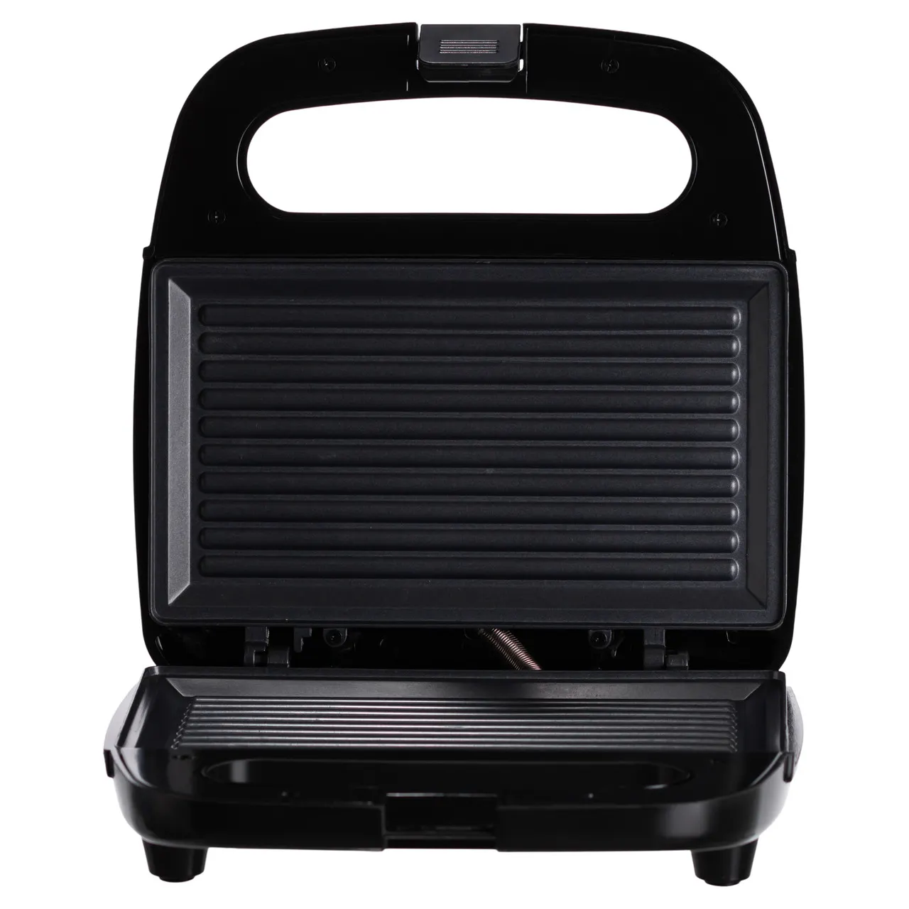 Пластины имеют ребристую поверхность размером 21.5×12.5 см, что способствует равномерному поджариванию продуктов и привлекательной текстуре. Корпус выполнен из термостойкого пластика с прорезиненными ножками для устойчивости и безопасности при работе.