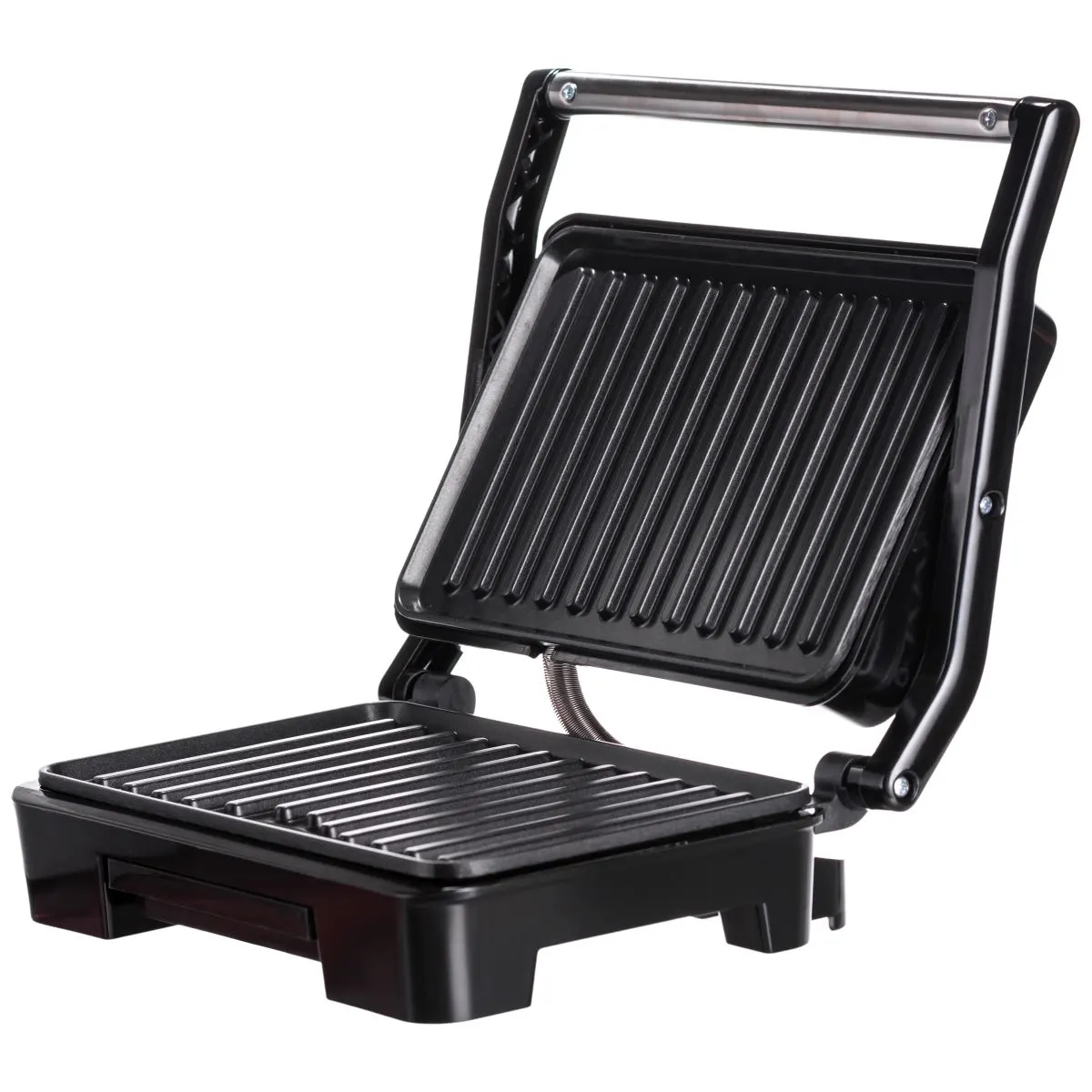 Корпус устройства изготовлен из металла и термостойкого пластика, что гарантирует устойчивость к высоким температурам и минимизирует риск деформации при продолжительной эксплуатации. Антипригарное покрытие пластин обеспечивает удобство в уходе и снижает необходимость использовать много масла при готовке.