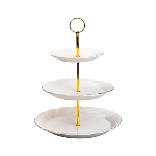 Эта трехъярусная этажерка выполнена из высококачественной белой керамики и предназначена для сервировки фруктов, десертов и других закусок. Она оснащена прочным металлическим каркасом, обеспечивающим надежную поддержку и устойчивость конструкции. Общая высота модели составляет 33 см, что позволяет компактно разместить три уровня с различным диаметром тарелок: 26 см (нижний ярус), 21 см (средний ярус) и 15,5 см (верхний ярус).
