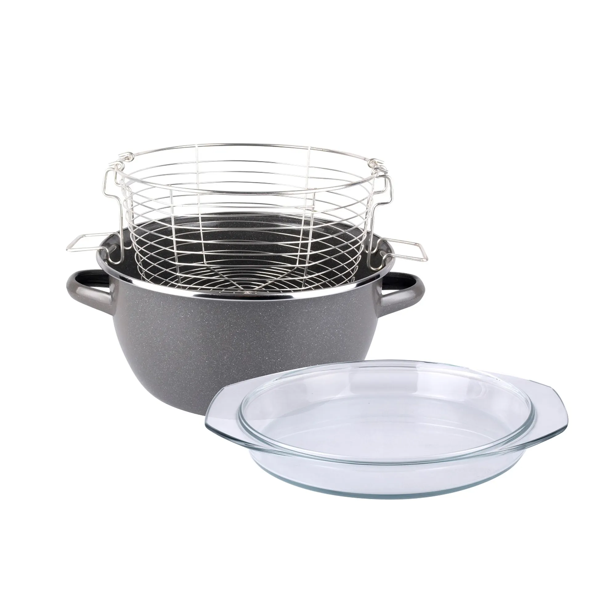Корпус выполнен из качественной эмалированной стали, а внутренняя поверхность покрыта современным слоем Quantum2 Granite, устойчивым к царапинам и коррозии. Крышка изготовлена из ударопрочного стекла, что обеспечивает надежность и безопасность эксплуатации.