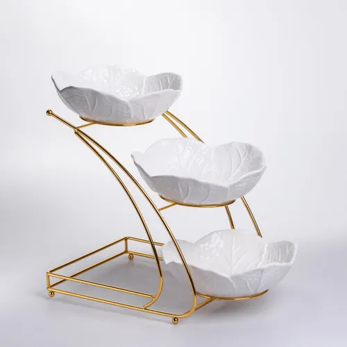 Трехъярусная фруктовница размером 36×22×33 см обладает продуманной конструкцией, позволяющей удобно подавать фрукты, сладости и закуски. Ее три фарфоровые тарелки белого цвета выполнены с изящной фигурной формой, расположены на металлической подставке золотистого оттенка, что обеспечивает устойчивость и привлекательный внешний вид изделия.