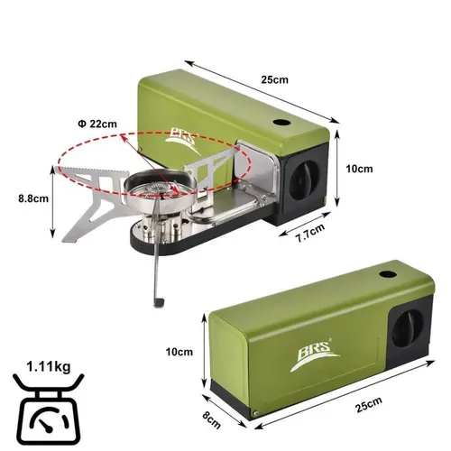 Горелка BRS-97 активируется методом пьезозапаливания и имеет встроенную ветрозащиту, чтобы сильные порывы ветра не гасили пламя. Складывающиеся зубчатые опоры позволяют устанавливать походную посуду диаметром от 100 до 260 мм.