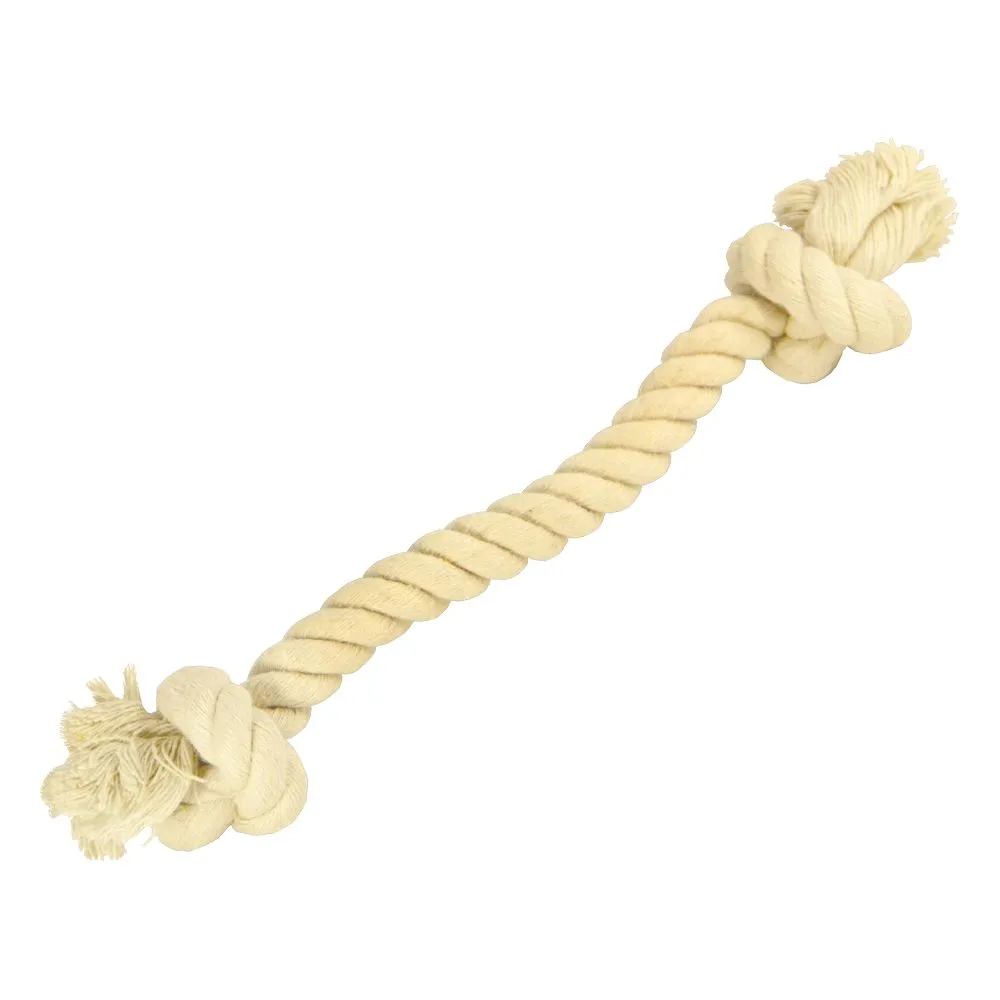 Игровая веревка является чрезвычайно важным аксессуаром, который нужен собаке не только в период прорезывания и замены молочных зубов взрослыми, но и для обеспечения нормального функционирования ее организма, ведь душераздирающая любовь четвероногих к грызению заложена в них природой. Данное изделие представлено в виде каната длиной 15 см с диаметром 14 мм, поэтому может использоваться для игр с щенками и собаками небольших пород. На обоих концах веревка завязана на узелок, за который игрушку будет удобно держать.