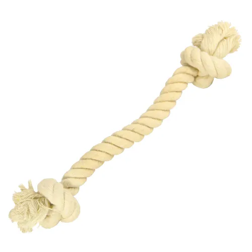 Данное изделие представлено в виде каната длиной 22 см с диаметром 14 мм, поэтому может использоваться для игр с щенками и собаками небольших пород. На обоих концах веревка завязана на узелок за который игрушку будет удобно держать.