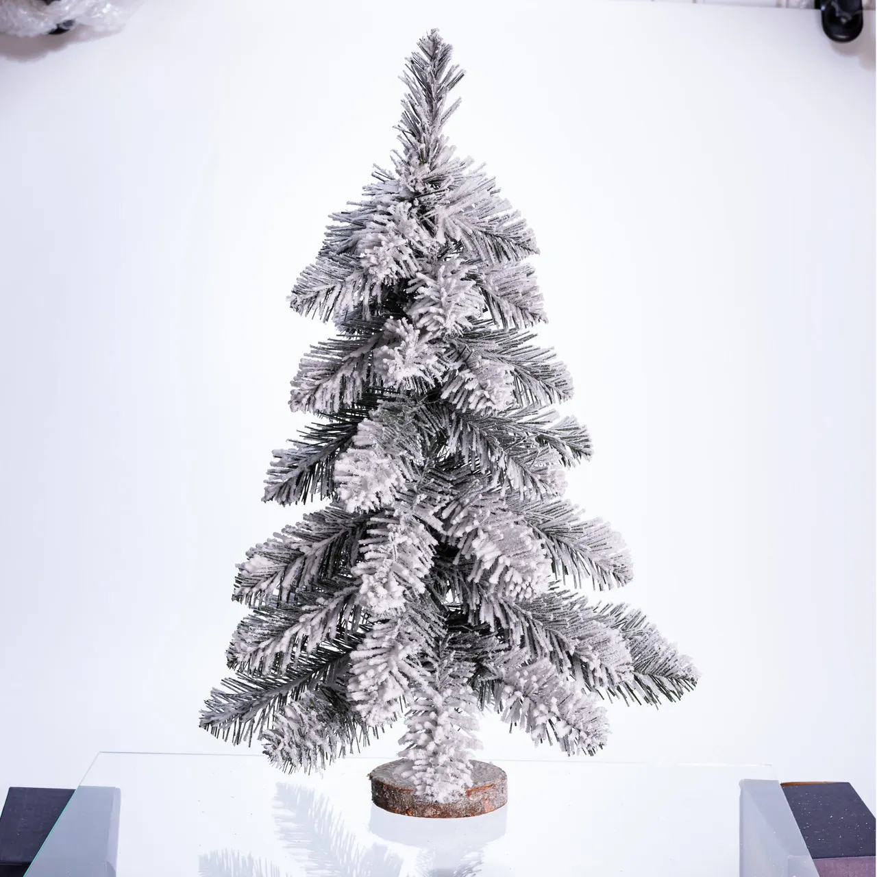 Настольная елка выполнена с использованием натуральной деревянной подставки — среза дерева, который обеспечивает устойчивость и стильное сочетание с зеленой хвоей, покрытой белым инеем. Благодаря компактным размерам и проработке деталей, изделие идеально подходит для создания праздничного настроения в небольших помещениях.