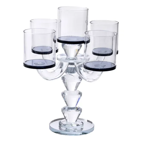 Канделябр на 5 свечей 19×19×24 см представляет собой изысканный декоративный элемент, выполненный из высококачественного стекла. Прозрачные цилиндрические колбы аккуратно расположены на плавно изогнутых держателях, что придает композиции лёгкость и элегантность. Зеркальное основание и контрастные черные детали усиливают визуальный эффект, создавая атмосферу глубины и праздничного настроения.