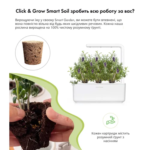 Установите картридж в смарт-пот, добавьте воды, подключите к сети — и наслаждайтесь ростом вашей лаванды. Простой процесс посадки и ухода делает систему Click&Grow идеальным выбором для начинающих садоводов или тех, кто хочет добавить немного зелени в городской интерьер.