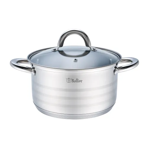 Кастрюля с крышкой BOLLIRE BERGAMO. Объем: 5,2 л. Диаметр: 24 см. Материал: нержавеющая сталь. Антипригарное покрытие: нет Наружное покрытие: зеркальная полировка с сатинированной отделкой. Пятислойное капсульное дно. Мерная шкала. Стеклянная крышка. Негреваемые металлические ручки. Вид крепления клепка. Подходит для всех видов плит.