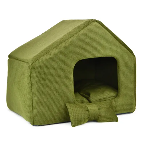 Основным материалом изготовления является мебельный велюр, известный своей мягкостью и устойчивостью к воздействию. Используемые материалы не впитывают запахи, что особенно важно для комфортного проживания домашних животных. Хатка представлена в зеленом цвете, который способствует созданию ощущения спокойствия и безопасности для вашего питомца.