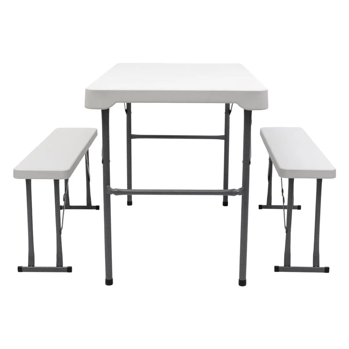 Стол изготовлен с использованием прочного пластика для столешницы и легкого, но надежного алюминиевого каркаса. Две лавочки сопровождают стол, обеспечивая удобные места для сидения и возможность компактного хранения. Такой комплект легко устанавливается и упаковывается, экономя пространство при транспортировке.