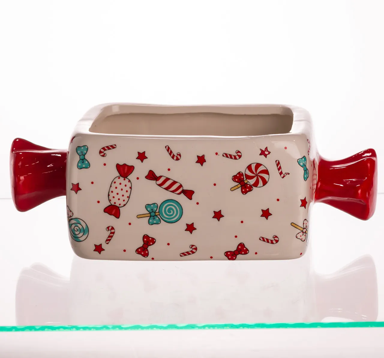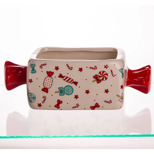 Фарфоровая конфетница размером 24×11.5×8 см с новогодним дизайном выполнена в форме яркой карамельки. Этот праздничный аксессуар изготовлен из качественного фарфора и украшен узором с изображением леденцов, конфет и звёздочек, что придаёт ему особый шарм и привлекательность.