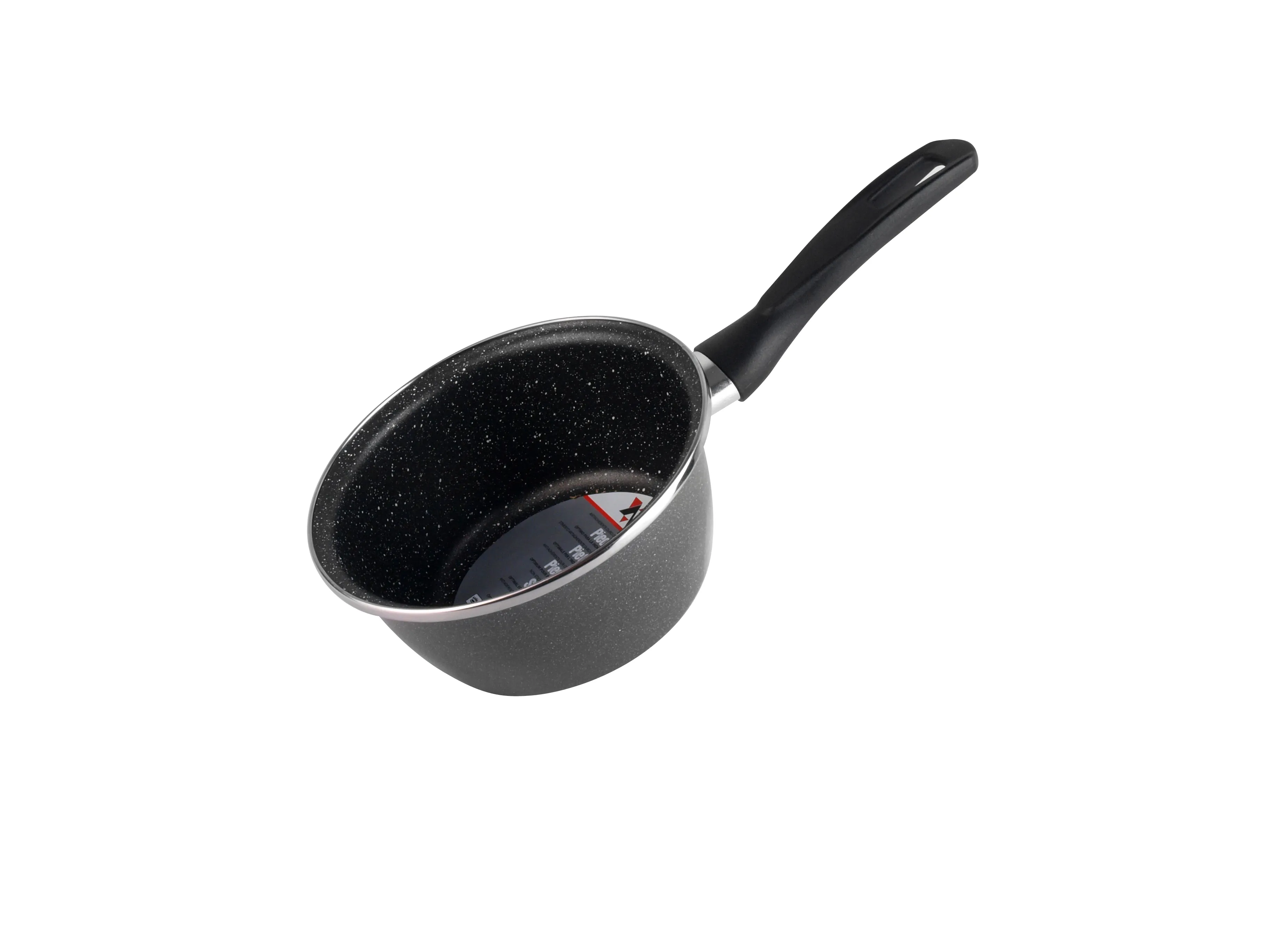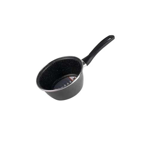 Ковш виготовлений із міцної емалевої сталі, закаленої при 820°C. Це забезпечує швидкий теплообмін і дозволяє економити до 30% енергії, що робить його економічним вибором для сучасних господинь. Стильний дизайн сірого кольору та корпус із сталі у поєднанні з ручкою з бакеліту надають ковшу елегантності та функціональності.