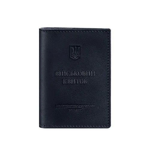 Кожаная обложка для военного билета (под военно-учётный документ) 7.4 А5 синего цвета представляет собой качественное изделие, созданное для надежного и долговечного хранения важного документа. Изготовленная из высококачественной натуральной кожи краст, эта обложка отличается прочностью и устойчивостью к внешним воздействиям. На лицевой стороне выполнено точное тиснение, полностью повторяющее оригинальный бланк военного билета, включая герб Украины вверху, надпись «Военный билет» по центру и указание Министерства обороны Украины в нижней части.