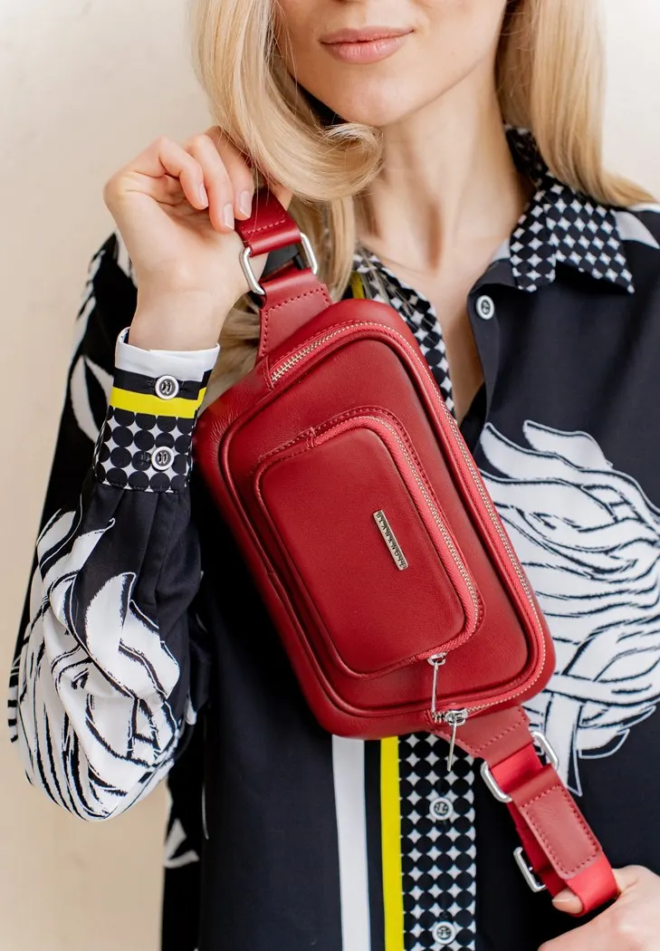 Кожаная поясная сумка-бананка Трапеция красного цвета сочетает в себе стиль и практичность. Ее можно носить как через плечо, так и на поясе, что обеспечивает максимальную свободу движений.