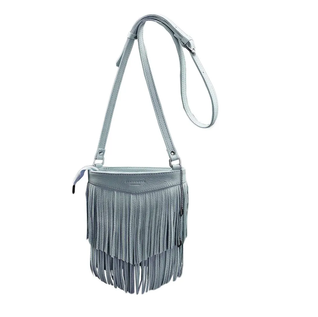 Ваша новая кожаная женская сумка с бахромой мини-кроссбоди Fleco голубая — это не просто аксессуар, а настоящее произведение искусства в стиле бохо. Её длинная бахрома привносит в повседневность свежесть и чувство свободы, отчего хочется впустить в жизнь нотку авантюризма.