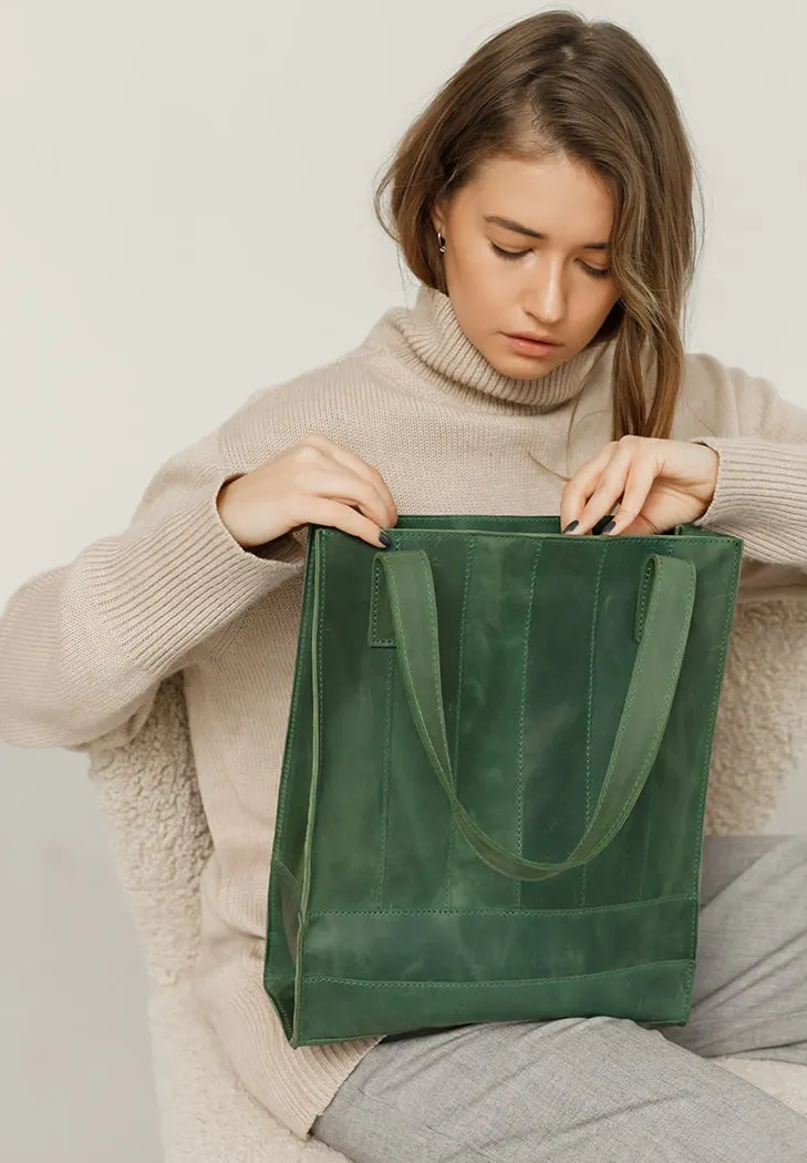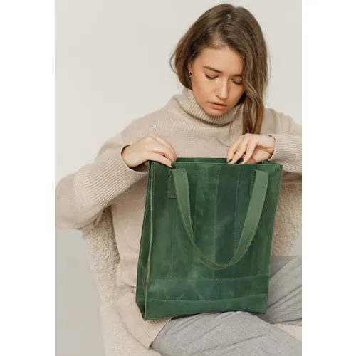 Кожаный женский шоппер Бетси - идеальный выбор для тех, кто ищет практичную и вместительную сумку на каждый день. Этот зеленый шоппер изготовлен вручную в нашей мастерской из полосок натуральной кожи Crazy Horse. Благодаря особой обработки, поверхность кожи легко и быстро затирается, но это только придает ей благородный состаренный вид. Crazy Horse отличается плотностью, эластичностью и износостойкостью. Она имеет матовую поверхность и мягкую внутреннюю сторону.