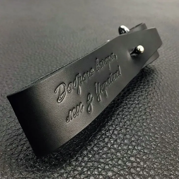 Предлагаем вашему вниманию уникальный кожаный брелок с гравировкой «Добрый вечер, мы с Украины». Изготовлен он из натуральной ременной кожи, которая отличается высокой прочностью и износостойкостью. Такой материал гарантирует долгий срок службы изделия и сохранение его внешнего вида даже при активном использовании.