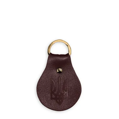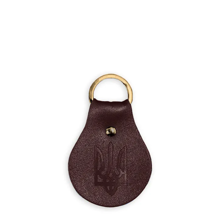 Дизайн брелока включает тиснение в форме Тризуба — национального символа, который подчеркивает патриотическую направленность аксессуара. Бордовый цвет кожи дополняет эстетику изделия, делая его стильным и универсальным дополнением к вашим повседневным вещам.