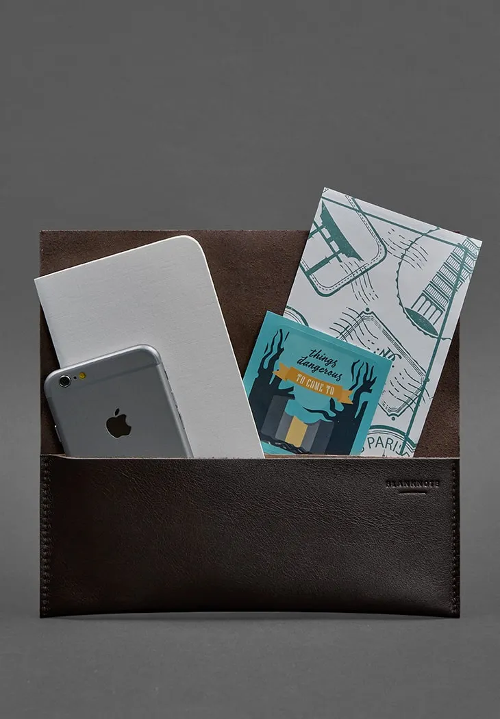 Особенностью данной модели является ручная работа, что гарантирует высокое качество пошива и долговечность изделия. Хлястик крепится при помощи двух люверсов, что позволяет использовать его также как держатель для ручки или карандаша на задней стороне кейса. Темно-коричневый цвет придает аксессуару изысканный и утонченный внешний вид, добавляя элегантность любому образу.