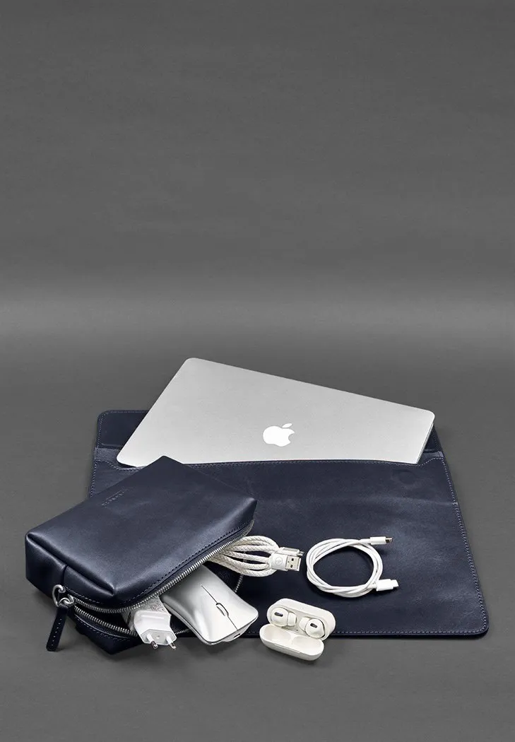 Кожаный набор Мобильный Универсальный темно-синий представляет собой стильный и практичный комплект аксессуаров, созданный специально для защиты и удобного хранения вашего ноутбука и сопутствующих устройств. В состав набора входят два главных элемента: чехол для ноутбука и несессер для проводов и мышки, выполненные из натуральной кожи высочайшего качества.