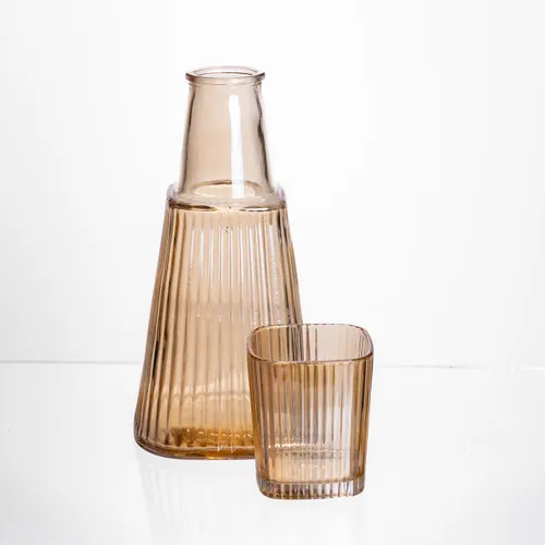 Набор из кувшина объемом 1 литр и стакана объемом 200 мл выполнен из прочного рифленого стекла коричневого цвета. Материал обладает высокой износостойкостью и обеспечивает длительный срок службы изделий. Благодаря декоративному гравированию поверхность набора приобретает изысканный внешний вид, который украшает кухню или столовую зону.