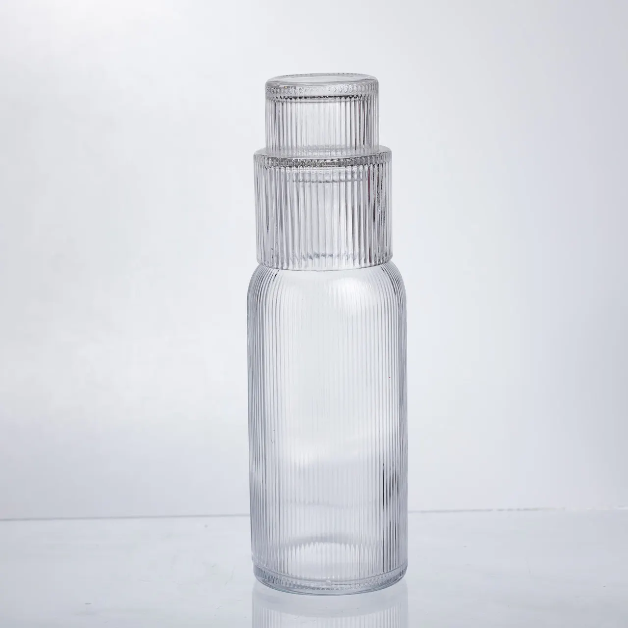 Данный комплект сочетает в себе практичность и утонченность благодаря рифлёной фактуре и прозрачности стекла. Уникальная конструкция со стаканом, надевающимся на кувшин, выделяет его на фоне иных изделий и обеспечивает удобство хранения.